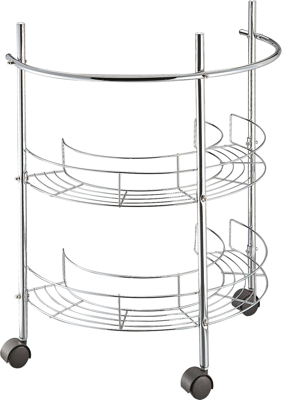 מעמד מדפים מתחת לכיור - דגם עגול: מעמד מדפי מתכת על גלגלים 2 קומות, מיועד לאחסון פריטים בארונות מתחת לשיש, גימור נירוסטה.